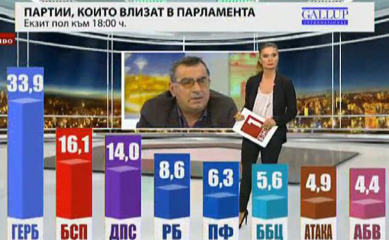 При такова разпределение се очаква ГЕРБ да получи 87 депутатски места в бъдещия парламент, БСП - 43, ДПС - 41, Реформаторският блок - 22, Атака и Патриотичен фронт - по 16, "България без цензура" - 15.