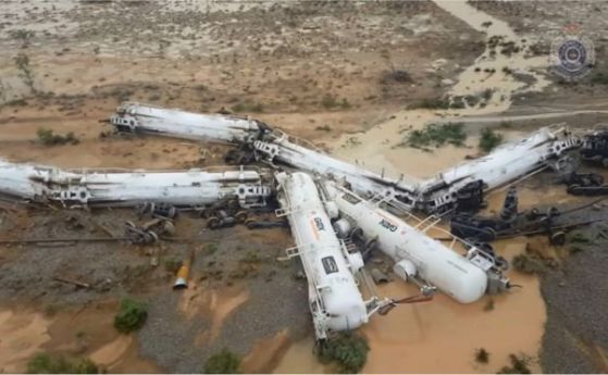 Влакът дерайлира вчера в Северна Австралия с 26 цистерни, пълни със сярна киселина и дизелово гориво.