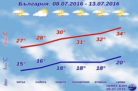 През почивните дни температурите отново ще започнат да се покачват и следващата сряда средната максимална температура за страната ще достигне 34 градуса. Минималната ще е 20 градуса, според прогнозата на НИМХ-БАН.