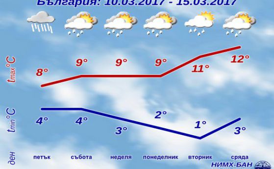 Максималните температури ще са предимно между 5 и 10 градуса, по морето и по-ниски, според прогнозата на НИМХ. В планините вятърът ще е силен, а по върховете термометрите ще се качат едва до минус 3 градуса.