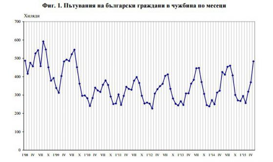 483 700 са българските граждани, напуснали страната ни през май тази година, което е с 13.1% повече в сравнение със същия месец на 2014 г. Увеличение на пътуванията е отчетено към Унгария - с 30.7%, Турция - с 27.4%, Гърция - с 25.5%, Испания - с 11.9%, Германия - с 11.2% и други. В същото време пък намаляват пътуванията към Израел - с 32.6%, Руската федерция - с 8.2% и бившата югославска република Македония - с 2.2%.