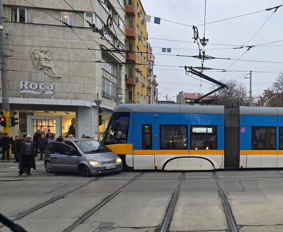 Автомобилът е леко ударен от трамвая, инцидентът е върху релсите.
