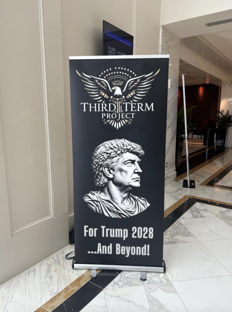 Днес в коридорите на Белия дом се появява постер с надпис: “Проект Трети мандат за Тръмп 2028... и отвъд!“ На постера: хералдически американски орел, не съвсем леко напомнящ орлите на римските легиони и главата на нашия любим президент, гражданина Гай Юлий Тръмп с венец на главата, в профил като за монета.