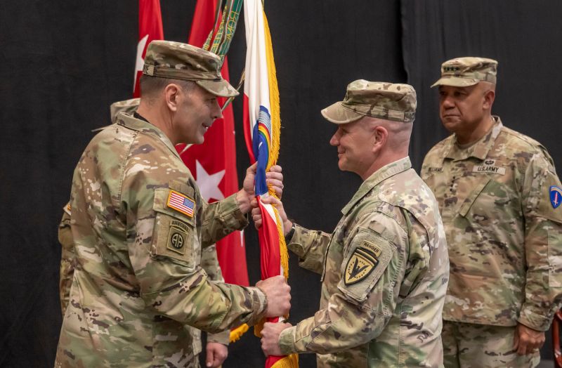 Ген. Каволи (в средата) предава знамето на ген. Донахю на церемонията по смяна на командването във Висбаден.