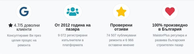 MaistorPlus е първата българска водеща онлайн платформа, даваща свобода на клиента да избере изпълнителя, с когото да работи. Потребителите разполагат с уникалната възможност да разгледат множество проверени отзиви от клиенти за майсторите и фирмите в сайта. Бързото сравняване на оферти и цени и навременната комуникация с изпълнителите, хвърля допълнителна светлина върху бързата и адекватна реализация на всеки ремонт.