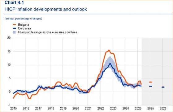 За 2025 г. е прогнозирана инфлация от 3,6%, за догодина - стопяване до 1,8%. ЕК и ЕЦБ отдават повишената инфлация през 2025 г. на "комбинация от политически обусловени увеличения на цените и по-широкообхватни увеличения на цените в няколко категории на потребление". ЕЦБ и ЕК изтъкват, че в началото на 2025 г. бяха отменени облекчения, въведени още по време на коронавирус пандемията (бел. ред. намалените ставки ДДС за заведенията, например).