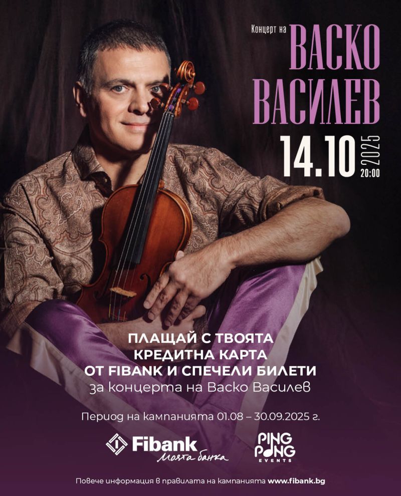Fibank (Първа инвестиционна банка) стартира промоционална кампания, която ще продължи до 30 септември 2025 г. включително и предоставя шанс за 50 двойни покани за концерта на Васко Василев в град София.
