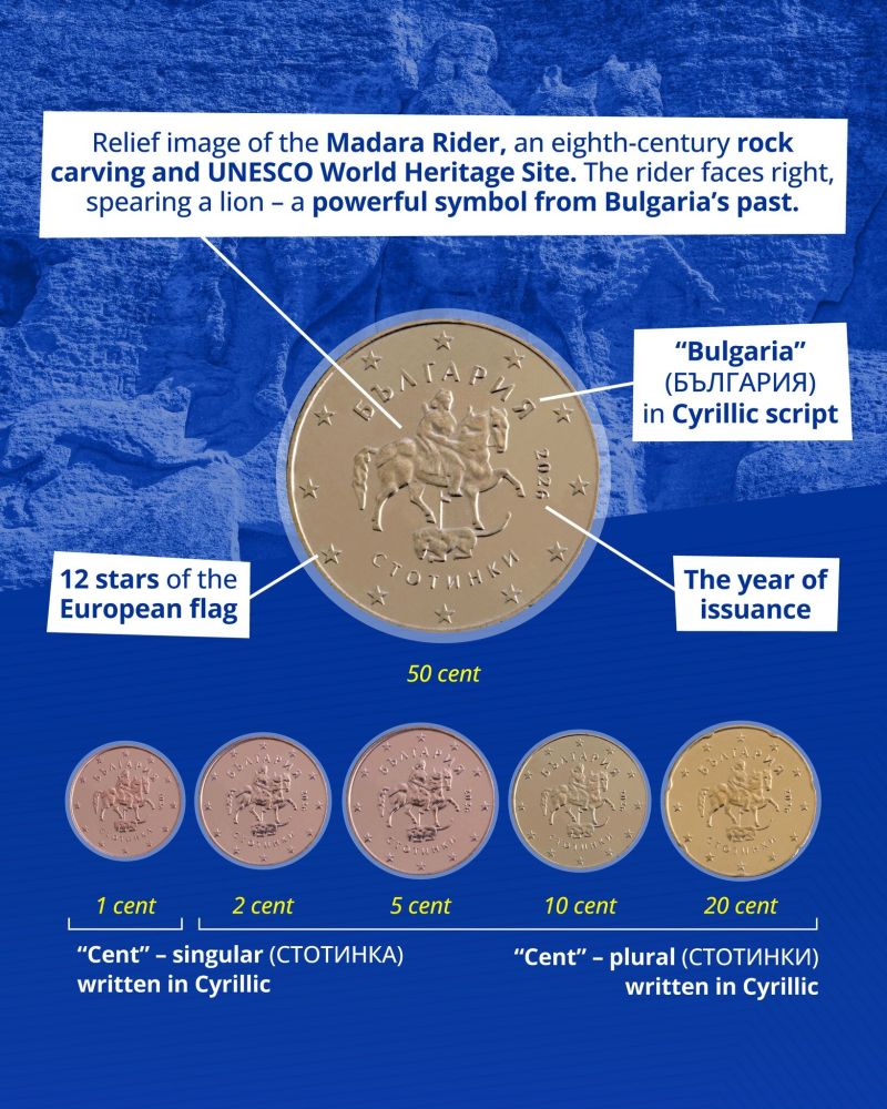 Председателят на Европейската централна банка Кристин Лагард показа българските евромонети с номинал 1, 2, 5, 10, 20 и 50 евроцента. Тя публикува във Facebook снимки на монетите.