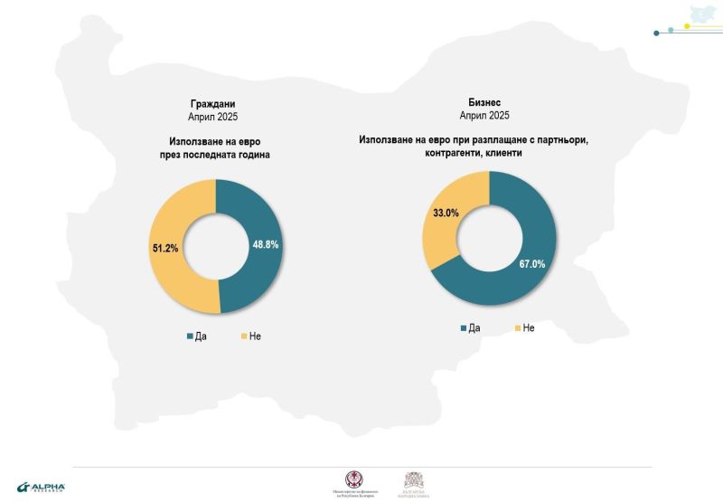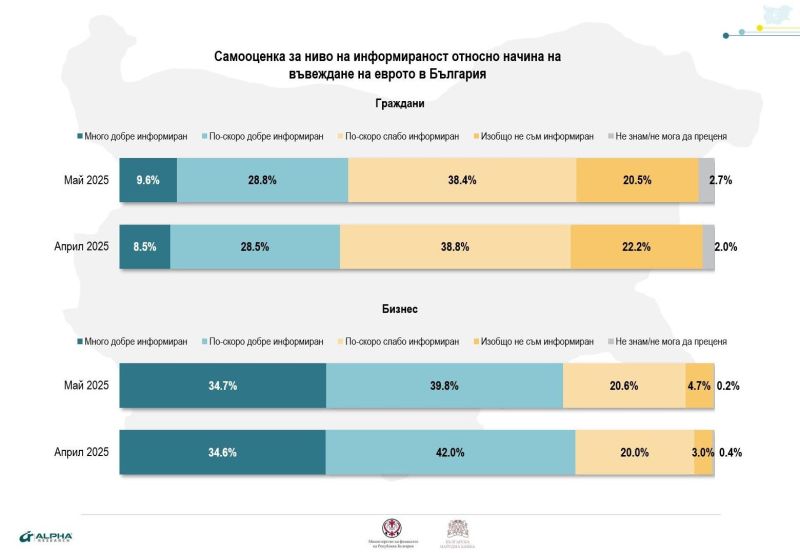 През периода 8-16 април и 22-28 май агенция Алфа Рисърч проведе две национално представителни проучвания на обществените нагласи сред граждани и бизнес за въвеждането на еврото в България. Възложител е Министерство на финансите. Анкетирани по домовете им чрез пряко стандартизирано интервю с таблети са по 1200 граждани над 16г. възраст през април и май. Отделно са анкетирани по 500 собственици или представители на управленско ниво на бизнеса, отговорни за вземането на решения за развитието на компанията.