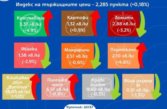 При зеленчуците цената е надолу при зелената салата - с 4,3 на сто до 1,12 лева за брой, зрелият лук кромид - с 3,7 на сто до 1,20 лева за килограм, доматите - с 3,2 на сто до 2,88 лева за килограм, и зелето - с 2,3 на сто до 1,36 лева за килограм. Поскъпват краставиците - с 4,9 на сто и се предлагат по 3,37 лева за килограм. Морковите също са нагоре - с 2,5 на сто до 1,25 лева за килограм, както и картофите, които качват с 0,9 на сто до 1,32 лева за килограм. Цената на зрелия чесън остава без промяна и той се търгува по 6,17 лева за килограм.