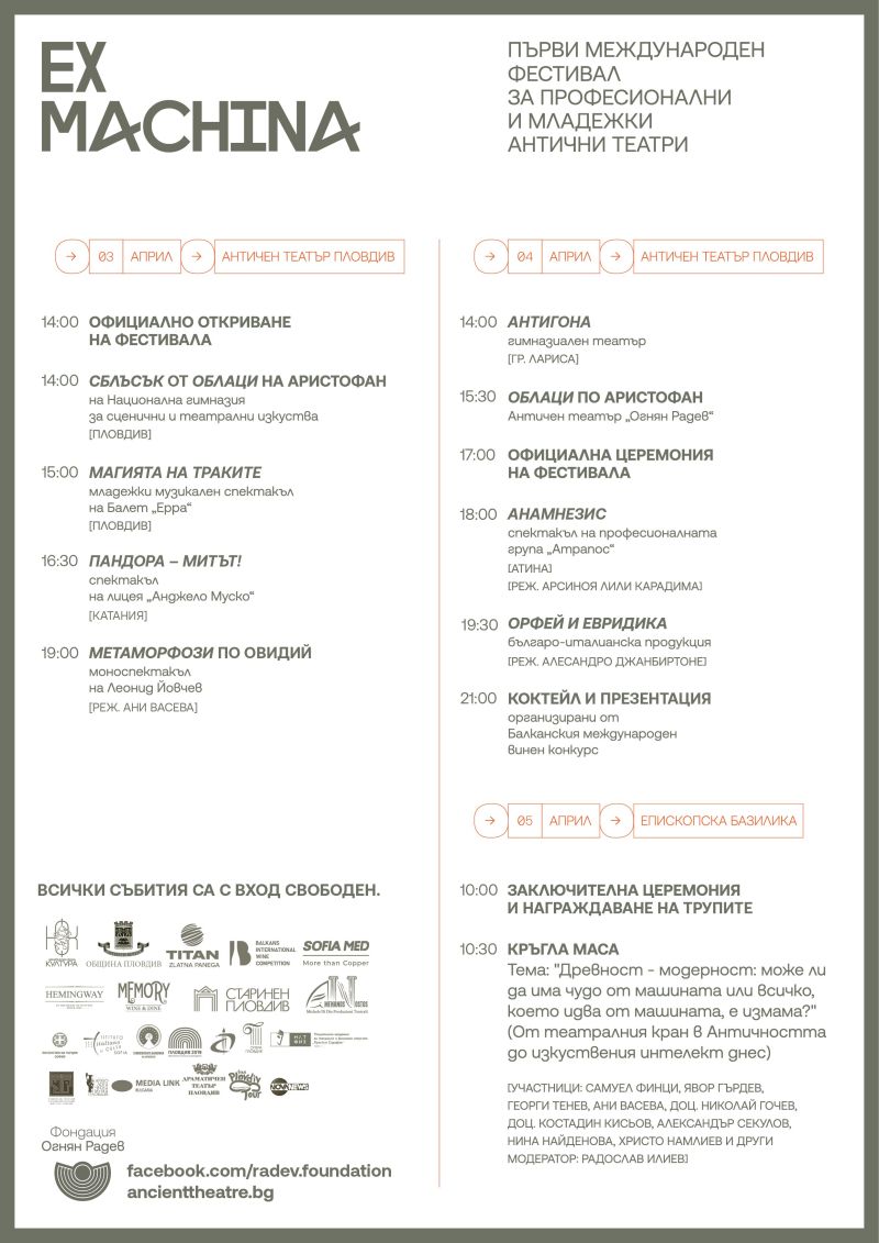 Организатор на фестивала EX MACHINA е Античен театър „Огнян Радев“, участниците са от България, Италия и Гърция. Фестивалът се осъществява с подкрепата на Национален фонд „Култура“ и в партньорство с община Пловдив, „Титан“, SofiaMed, Балкански винен конкурс, международната мрежа за антични театри Аменанос Ностос, посолствата на Италия и Гърция в България, ОИ „Старинен Пловдив“ и редица други частни и неправителствени организации, както и с медийното партньорство на Nova News.