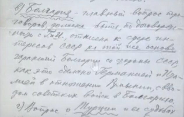 България - главният въпрос на преговорите трябва да бъде, (България) да бъде отнесена към сферата на интереси на СССР, на същата основа като договорите на Германия и Италия по отношение на Румъния (и това да стане) с въвеждане на съветски войски в България.