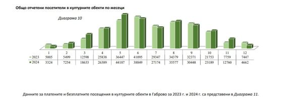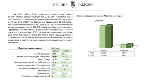 Оказва се, че въпреки направените инвестиции в музеите, все още общата посещаемост на музеите е далеч от данните за 2019 г. Именно през 2019 г. културните институти в Габрово са привлекли най-голям брой посетители – общо 319 747, докато за 2024 г. са отчетени общо 272 446 посетители – увеличение с около 5% спрямо 2023 г.