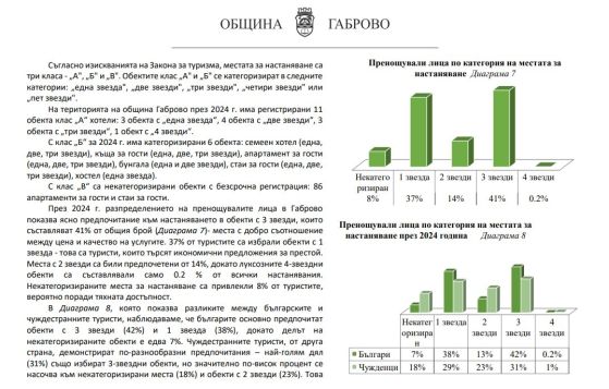 От този документ разбираме, че по данни на Община Габрово и съгласно Единната система за туристическа информация (ЕСТИ) в края на 2024 г. на територията на общината са регистрирани 52 заведения за хранене и развлечение и 204 места за настаняване (с обща леглова база от 2 500 броя).