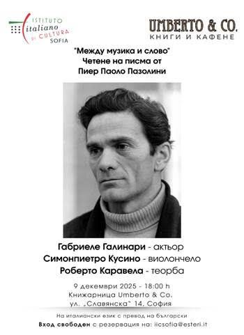 На 9 декември 2025 г. Istituto Italiano di Cultura Sofia организира специална вечер в София, посветена на 50-годишнината от смъртта на Pier Paolo Пазолини — един от най-значимите, противоречиви и многолики интелектуалци на XX век. Събитието носи заглавието „Pier Paolo Пазолини: между музика и слово“ и предлага на публиката интимно пътешествие чрез писмата на Пазолини, прочетени от актьора Gabriele Galinari, в съпровод на виолончело и теорба. В музикалния фон звучат произведения на Бах и на барокови музиканти, изграждайки диалог между думите и звука — подход, който и самият Пазолини би оценил.