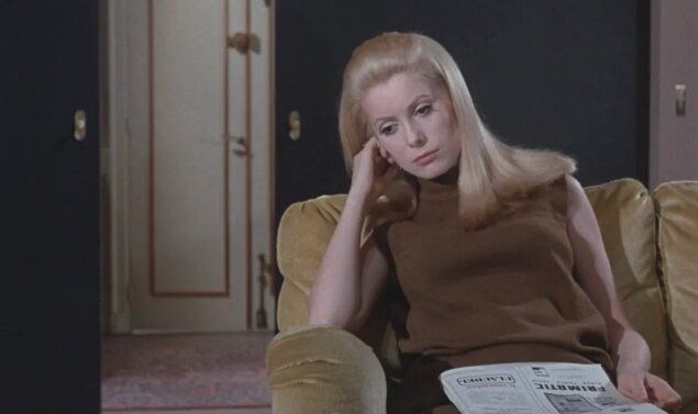 Филмът е Belle de Jour, една от най-известните роли на Деньов и първата от няколкото, за които Сен Лоран създава гардероба ѝ. В ролята на Северин, буржоазната домакиня, която се сдобива с тайна работа в парижки публичен дом, тя е толкова безупречно облечена в класически кожени палта с косъм и двуредни рокли, че подозирам, че за много съвременни жени дрехите са толкова възбуждащи, колкото и еротичните фантазии на Северин. Деньов го обяснява с непреходността на моделите. „Когато гледате филми от този период, те понякога могат да бъдат наистина остарели, знаете, визуално...“ Но Belle de Jour не е остаряла нито за миг. „Не, защото той съществува извън времето.“