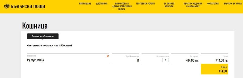 "Български пощи" предлагат абонамент за 2025 г. за списание "Мурзилка". Цената за 11 броя, доставени от Русия, е 414 лева.