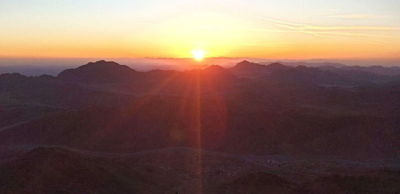 Излизат на върха. Умората от нощния преход е натежала. Сяда да си почине на огромна плоска скала в подножието на каменен параклис. Тук, значи, Мойсей е получил заповедите. Околовръст, оцветена в предизгревно червено, се е проснала надлъж и нашир цялата Синайска планина. Гледки галят изтощените сетива. На хоризонта полека лека изплува огненочервеното слънце. Изглежда му като Божие око, което го гледа. Може би с поглед Бог нещо му съобщава? Чувства, че не може да помръдне. Красотата и могъществото на синайския изгрев са го приковали към скалата.