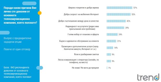 Най-често посочваните причини за положителната оценка са широкото покритие (57%) и добрата скорост на мрежата (53%), следвани от съотношението цена–качество (42%) и надеждността на услугите (39%).