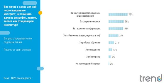 Основна функция на интернет остава комуникацията – така отговарят 72% от анкетираните. Интернет се използва в приблизително еднаква степен за сърфиране в социални мрежи (58%) и за търсене на информация (56%), като жените и хората до 50-годишна възраст са по-активни в социалните мрежи, докато мъжете и хората между 40 и 60 години – при търсенето на информация.
