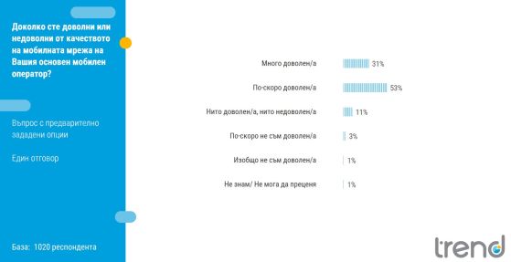 84% от българите са удовлетворени от мобилните услуги, също толкова са оценили положително и домашния интернет, а 82% са доволни от платената телевизия.