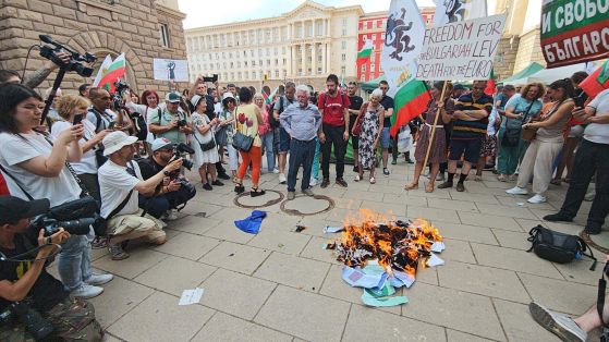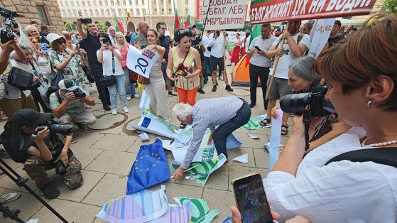 Протестиращите се събраха в пространството между сградата на Народното събрание и президентството и настояха за запазване на лева и България да не влиза в еврозоната.