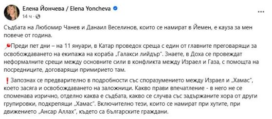 Йончева обяснява, че на 11 януари е разговаряла в Доха с един от главните преговарящи за освобождаването на екипажа на кораба. Запознала се е със споразумението между Израел и "Хамас", което засяга и освобождаването на заложници.