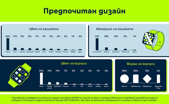 Подобно е положението и при цветовете на каишките, където 62% са черни. Белите са 11%, златистите – 9%, а сребристите – 8%. Когато говорим за материала им, най-предпочитани са силиконовите модели (72%), кожените заемат второ място с 18%, трето е за металните – 13%, а само 5% от потребителите са заложили на текстил.