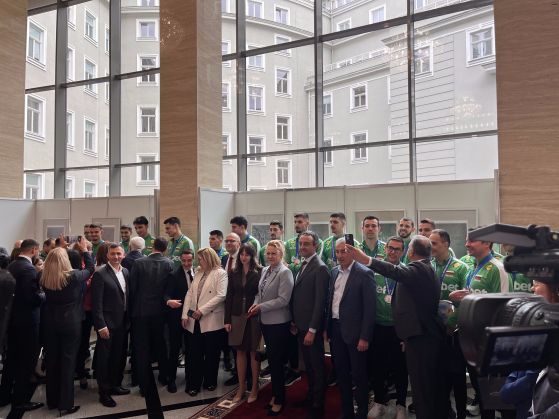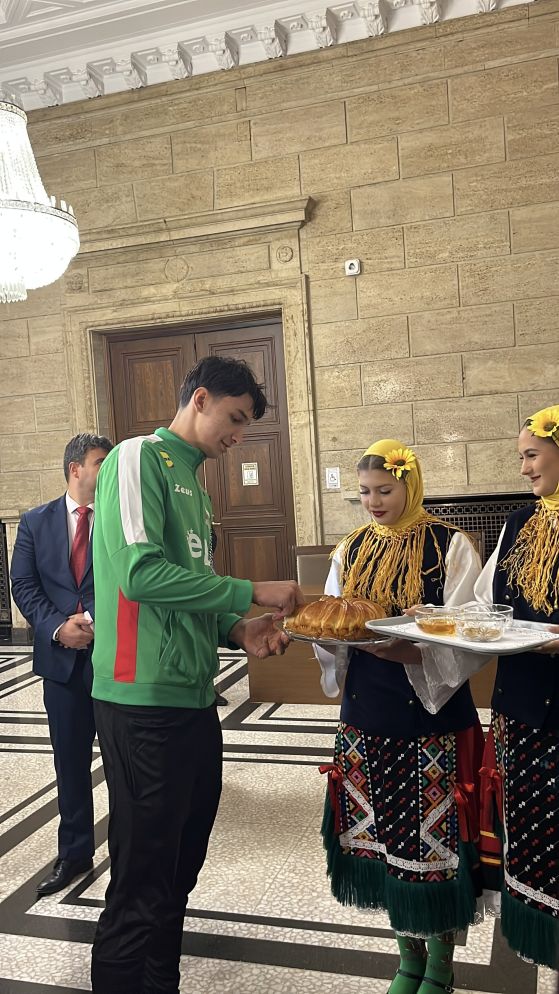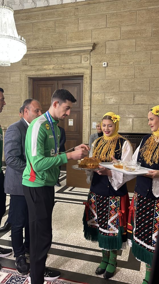 Националите бяха посрещнати с питка и мед, след което раздадоха автографи и се снимаха с парламентарните групи.