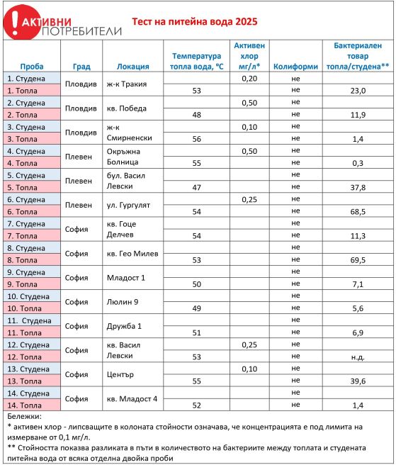 Анализираните химически показатели от всичките 14 локации са в норма. В таблицата са показани само резултатите за съдържание на активен хлор от които се вижда, че само в 7 от тях се откриват нива над 0,05 мг/литър, което е лимитът на детекция на използвания от нас тест. Регулаторната норма от 0,5 мг/л, не се надхвърля от нито една проба. В половината от пробите студена вода не беше открит хлор. Аналогично, в нито една от 14-те образци събрани от погрята вода не беше установено наличие на хлор. В София активен хлор се открива само в 2 от 8 локации. Установеното отсъствие на дезинфектант в половината проби студена, както и всички такива топла вода, увеличава риска от развитие на нежелателни и потенциално патогенни за хората микроорганизми. Всичките 14 двойки проби бяха анализирани и за наличие на основните индикаторни микроорганизми, колиформи и Escherichia coli, но такива не бяха открити.