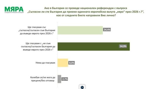 Според социолозите на "Мяра" обаче закономерно едва ли такава активност би се възпроизвела на практика. Ако в България се проведе национален референдум с въпроса: "Съгласни ли сте България да приеме единната европейска валута "евро" през 2026 г.?", кое от следните бихте направили Вие лично? 34,4% казват, че ще гласуват със съгласна/съгласен, а 54,9% – че ще гласуват с несъгласна/несъгласен. Останалите няма да гласуват или се колебаят.