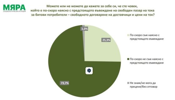 Липсва готовност и по отношение на либерализацията на пазара на тока. "По-скоро съм наясно с предстоящото въвеждане", казват 25,3%, "По-скоро не съм наясно с предстоящото въвеждане", избират 73,7%. При такива въпроси често има декларативност и престижност в отговорите, но дори и тя не помага за по-висок дял на отговори от типа "смятам, че съм наясно".