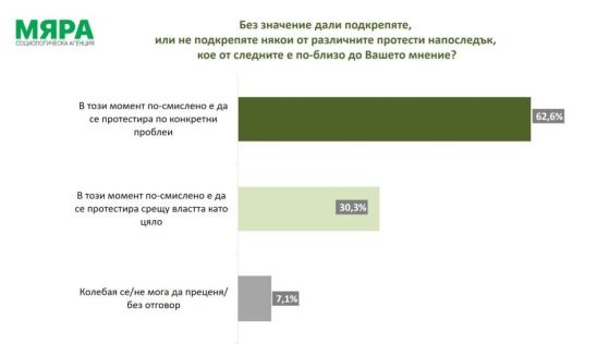 "В този момент по-смислено е да се протестира по конкретни прoблеми" – тази опция избират 62,6% от запитаните, а малцинство от 30,3% избират мнението, че "В този момент по-смислено е да се протестира срещу властта като цяло". Явно затова и мнозинството не подкрепя вотовете на недоверие към сегашното правителство.