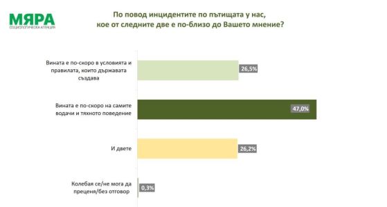 По отношение на катастрофите по пътищата беше направен социологически експеримент: запитаните бяха помолени да изберат само един отговор измежду опциите "Вината е по-скоро в условията и правилата, които държавата създава" и "Вината е по-скоро на самите водачи и тяхното поведение". В така поставената дилема 26,5% говорят за рамката, а 47% – за самите водачи, но 26,2% не могат да отделят едното от другото.