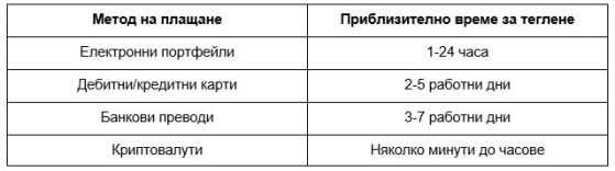 Продължителността на обработката ще варира в зависимост от метода на плащане и процеса на сайта за залагания. Следва приблизителен график за всеки метод: