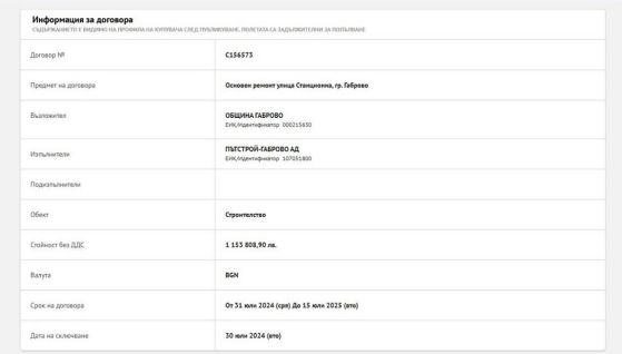 Обществената поръчка е за близо 5 милиона лева като бе избрана втората най-висока оферта, а именно – тази на ДЗЗД „ГРАДСКА СРЕДА НА ГАБРОВО 2016-2“, което включва фирмите ГРАДСКА СРЕДА НА ГАБРОВО 2016 – 2, КОТА-2001 ООД и ДИМАС АД. Тяхната оферта е на стойност 4 822 058,63 лв. без ДДС, а договорът е сключен след приключване на процедурата на обжалване към КЗК – на 03 септември 2024 г.