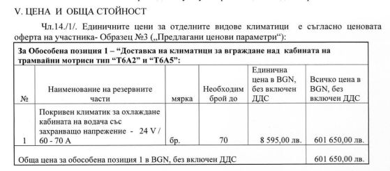 Климатици за по 10 000 лева ще монтират столичният градски транспорт в кабинките на ватманите на по-старитеб трамваи. Цената е в пъти над пазарната, а цялата поръчка е за 601 650 лева без ДДС.