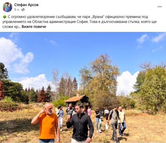 Паркът "Вранa" официално е преминал под управлението на Областната администрация в София, съобщи областният управител Стефан Арсов във Фейсбук.