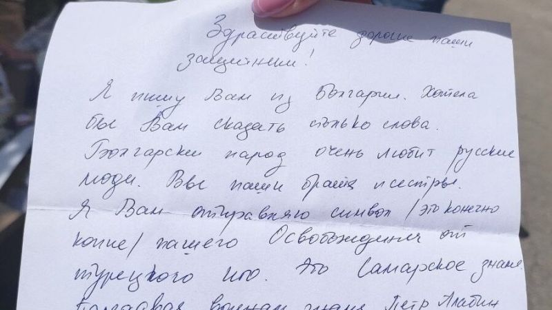 Руските медии показват и едно от писмата, в което непознатото руско Z-другарче е наречено защитник. „Здравейте скъпи наши защитници, пиша ви от България. Бих искала да ви кажа толкова много думи. Българският народ много обича руските хора, вие сте наши братя и сестри“, пише „детето“, което за ръчното изписване на буквата та използва чертичка над основната буква, изписване, характерно повече за старото поколение.