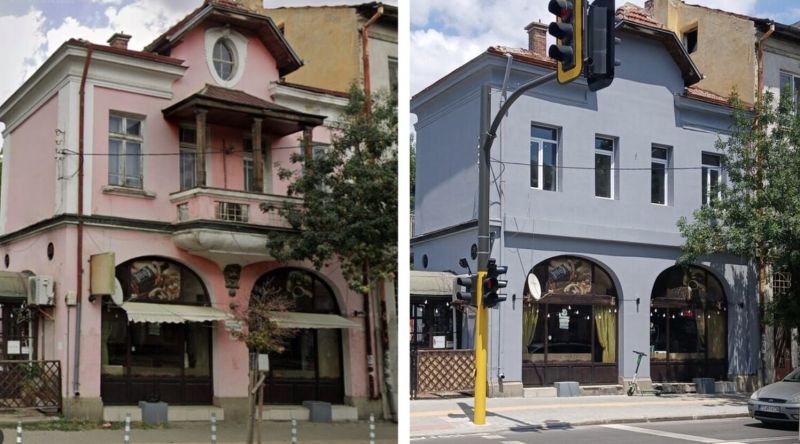 Артистичният балкон е унищожен, а двете врати към него – запълнени с тухли итонг и смалени до прозорци с PVC дограма. Овалният прозорец на върха й, под покрива, също е изчезнал. След ремонта къщата е пребоядисана изцяло в нюанс на синьото, макар автентичните цветове да са бледорозово и бяло, написа в социалните мрежи депутатът от "Продължаваме промяната - Демократична България" (ПП-ДБ) Манол Пейков.