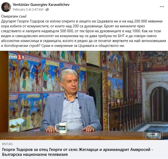 Другарят Георги Тодоров се изплю открито в лицето на Църквата ни и на над 200 000 невинни хора, избити от комунистите, от които над 200 са духовници. Броят на миналите през следствието и лагерите надхвърля 500 000, от тях броят на духовниците е над 1000. Как на този виден и самодоволен апологет на комунизма му се дава трибуна по БНТ и да говори смело абсолютни измислици в седмицата, когато е редно да се почетат жертвите на най-античовешкия и богоборчески строй? Срам и омерзение за Църквата и обществото ни.