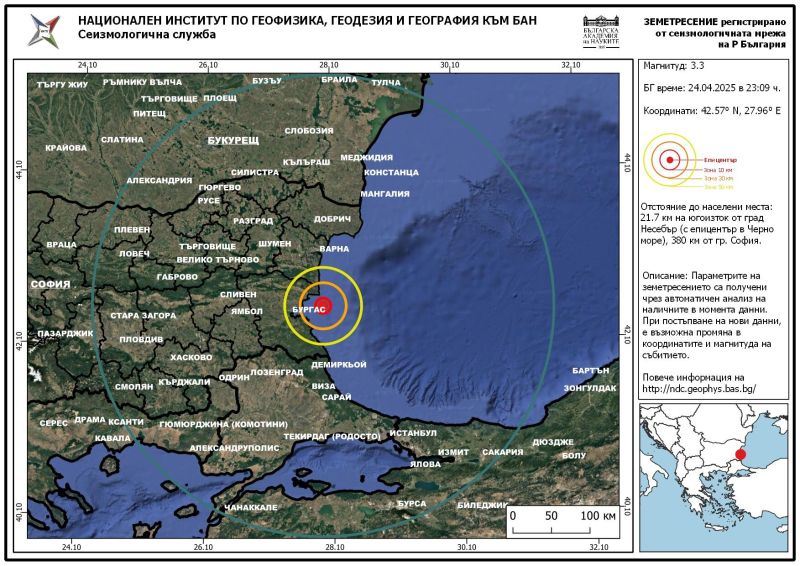 По данни на Националния сеизмологичен център към Националния институт по геофизика, геодезия и география - БАН, трусът е станал снощи, в 23:09 часа с епицентър на 30 км от Бургас.