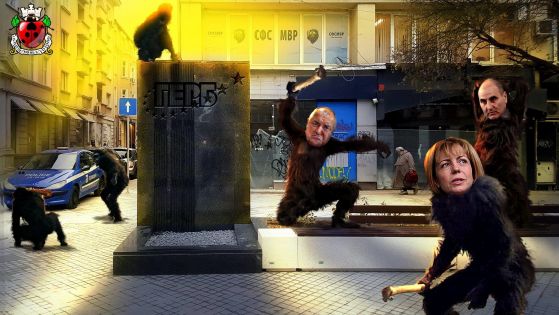 Колаж на Иван Червенков от Фейсбук, който прави връзка с монолита от филма "Космическа одисея", който прилича на водната стена на "Гарибалди", а в лентата е заобиколен от човекоподобни маймуни.