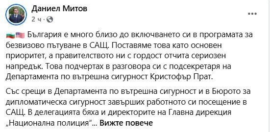 "Надявам се, че тя ще бъде положителна, за да завършим успешно пътя, който започнахме заедно преди много години. Поканих представители на Департамента по вътрешна сигурност да проведат мисия у нас, с която да проверят на място готовността ни за влизане в програмата", пише още Митов.
