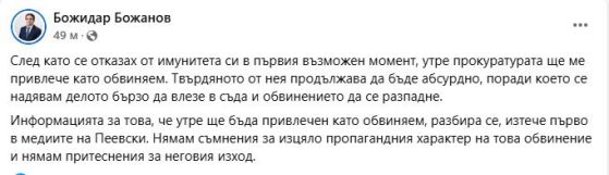 Информацията за това, че утре ще бъда привлечен като обвиняем, разбира се, изтече първо в медиите на Пеевски. Нямам съмнения за изцяло пропагандния характер на това обвинение и нямам притеснения за неговия изход."