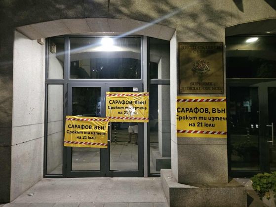 Съдебната палата в София и сградата на Висшия съдебен съвет осъмнаха окичена с плакати срещу оставането на Борислав Сарафов като и.ф. главен прокурор.