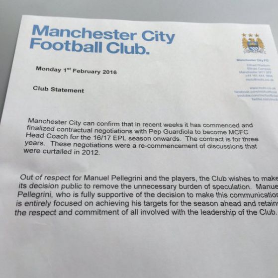 Договорът на Гуардиола с английския клуб е за срок от три години, като контрактът му започва да тече от началото на сезон 2016/2017.