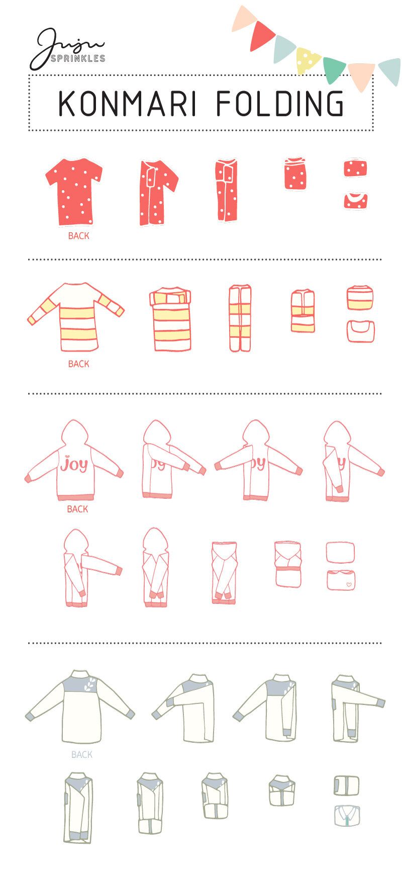 Специалисти по домашната организация обясняват, че хоризонталният вариант на сгъване на дрехи е най-универсален. Подоходящ е и добре работи за по-обемни дрехи – пуловери, дънки, суичъри. При него не се изискват специални умения и позволява максимално използване на пространството в дълбоки рафтове.