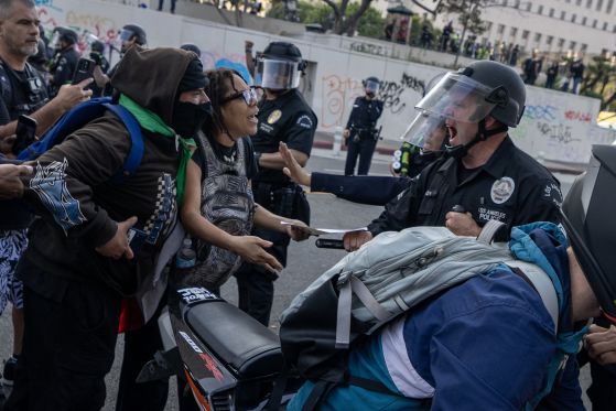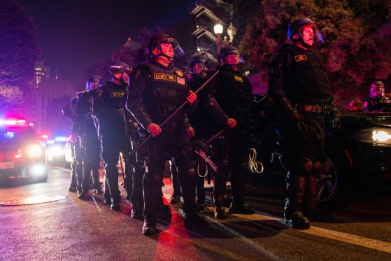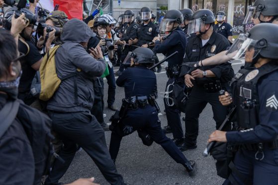 Вчера полицията се насочи към протестиращите, стреляйки с гумени куршуми по тълпите, които бяха видени да се разпръскват по улиците на Лос Анджелис.