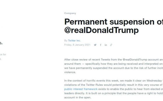 След смъртоносните бунтове от 6 януари в Капитолия, достъпът на Тръмп до Twitter и Facebook беше блокиран, заради "риска от нови подстрекателства към насилие".